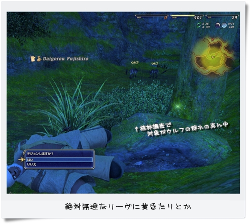 報酬の装備に釣られて伐採しに行ったら、なぜか犬ころとじゃれあったりとか。